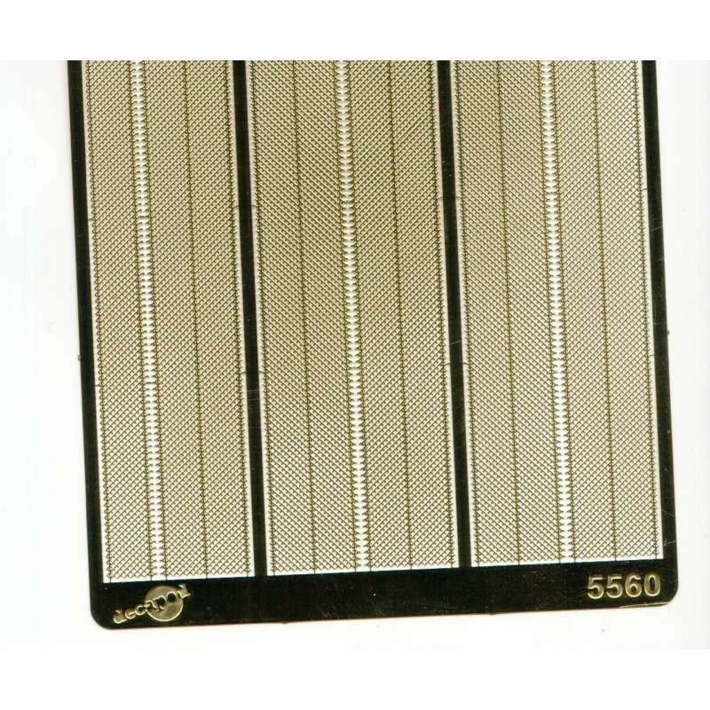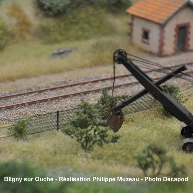 Notre réalisation version 2016 est en laiton de 0,15 mm d'épaisseur et se présente sous un format de 5 longueurs de 232 mm auxquels vient s'ajouter une dernière longueur de 232 mm en "50 cm" de hauteur ; ça peut toujours servir, nous n'allions pas laisser bêtement cet espace... Profilés laiton en T de 1x1 mm fournis pour les piquets, à coller (cyano) ou à souder.