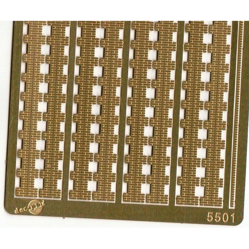 Nous avons réalisé ces références en laiton photogravé de 0,25 mm car cela reste à nos yeux le meilleur moyen d'obtenir un résultat propre et bien plus facile à découper et décorer qu'on ne le supposerait ; le laiton de 0,25 mm se découpe facilement à l’aide d’un cutter ou aux ciseaux, en s’aidant des joints gravés pour se guider. Il suffit ensuite de s’en servir pour habiller une structure en plastique ou en carton de conception personnelle, voire un kit de bâtiment que l’on souhaiterait modifier.