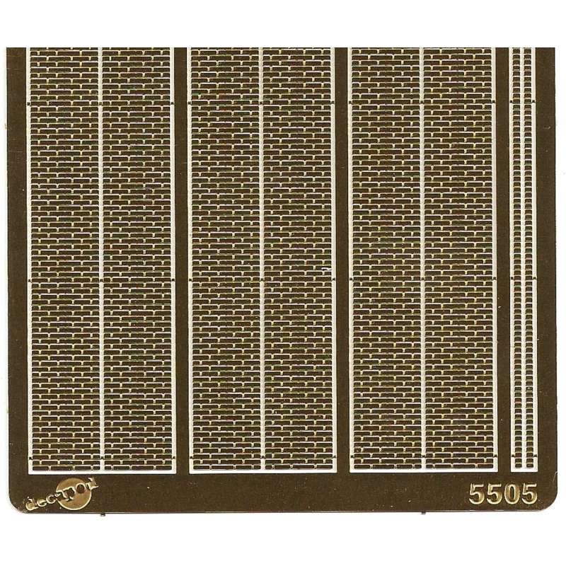 Nous avons réalisé ces références en laiton photogravé de 0,25 mm car cela reste à nos yeux le meilleur moyen d'obtenir un résultat propre et bien plus facile à découper et décorer qu'on ne le supposerait ; le laiton de 0,25 mm se découpe facilement à l’aide d’un cutter ou aux ciseaux, en s’aidant des joints gravés pour se guider. Il suffit ensuite de s’en servir pour habiller une structure en plastique ou en carton de conception personnelle, voire un kit de bâtiment que l’on souhaiterait modifier.