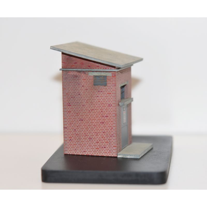 Structure en carton habillé de laiton de 0,2 mm pour les briques, avec une grille de protection de la fenêtre en maillechort de 0,1 mm. Les persiennes de ventilation sont en fonderie de métal blanc.